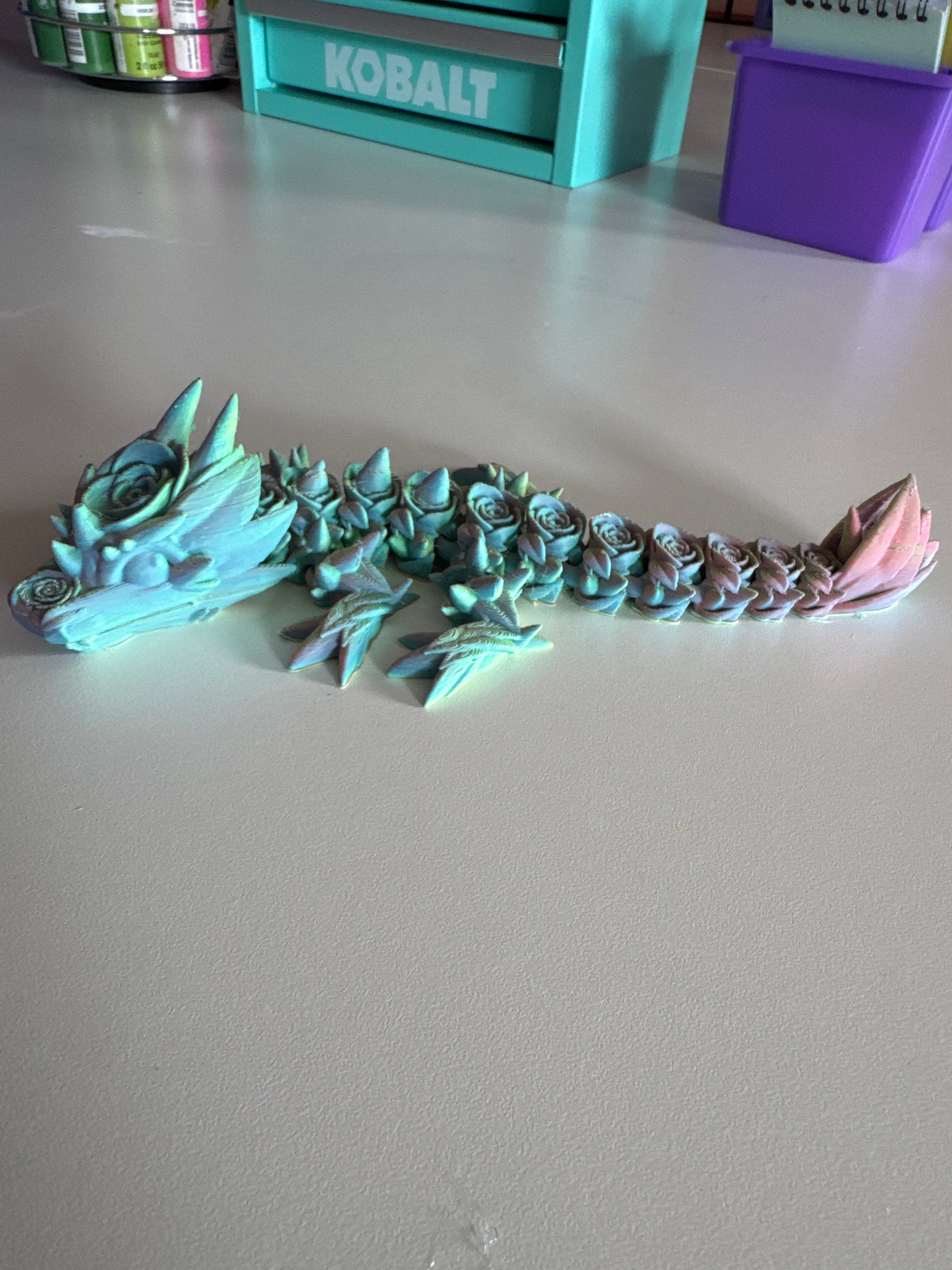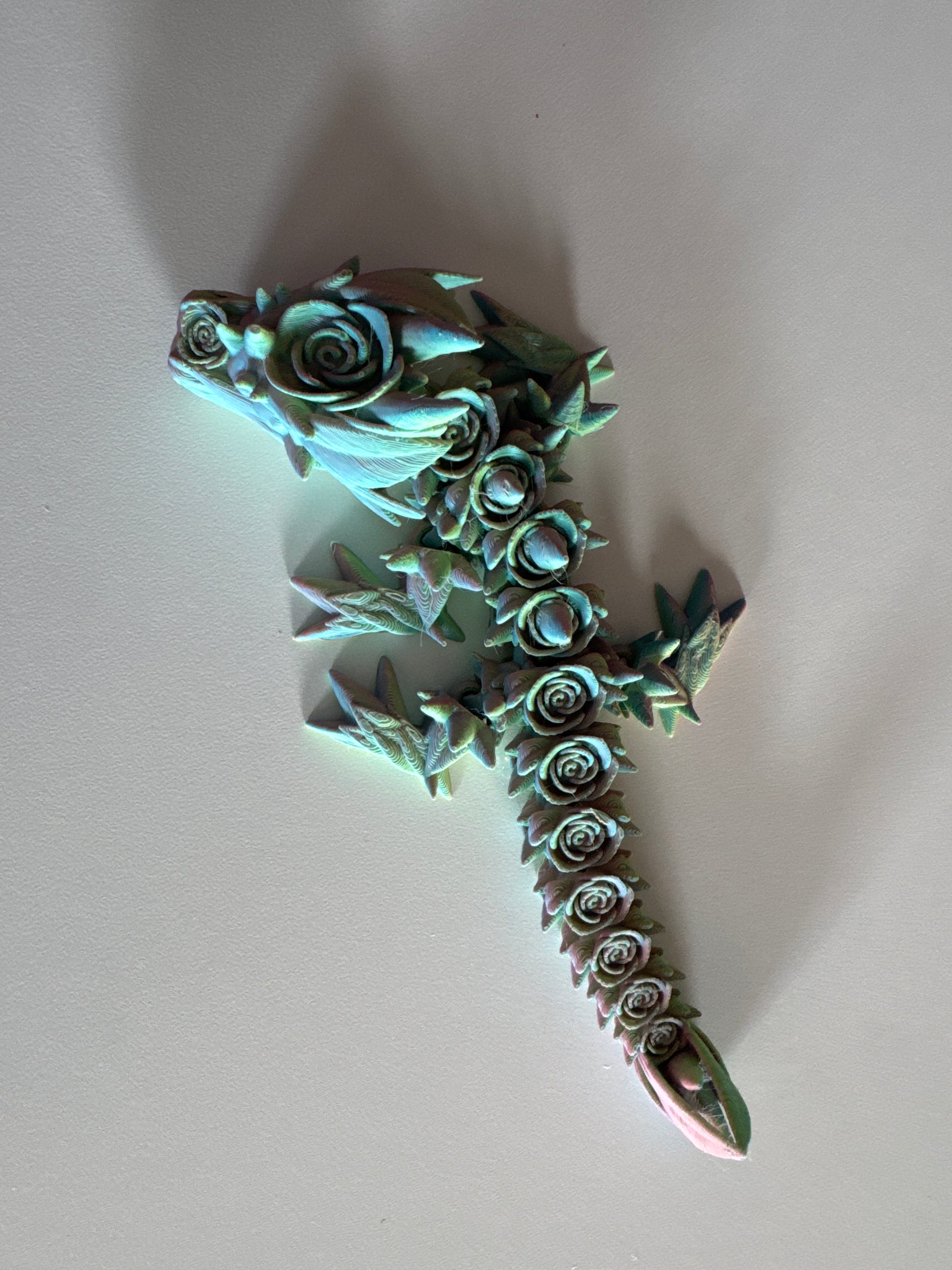This 3D-printed dragon has a unique design, featuring rose petals along its spine that are able to articulate.