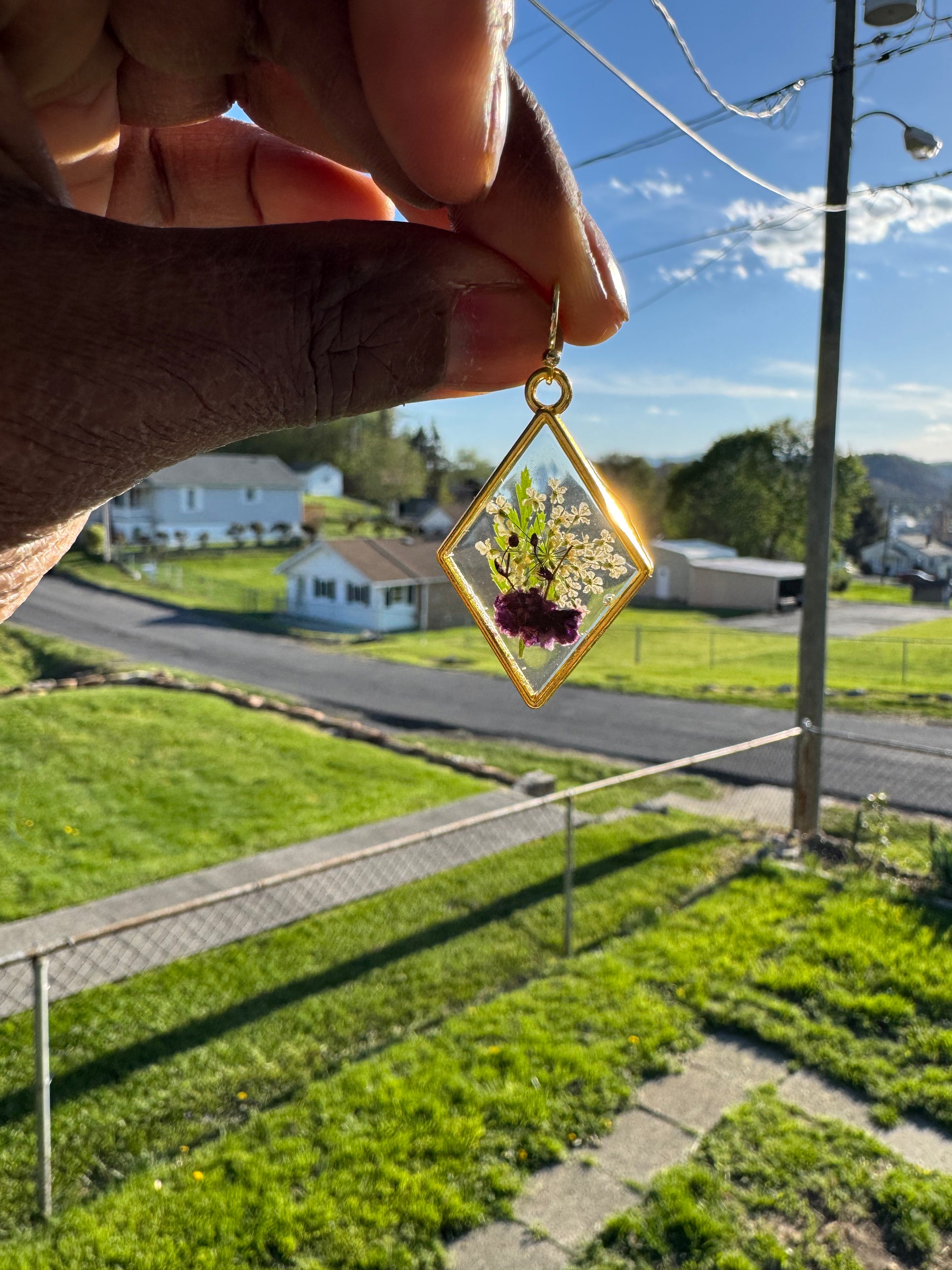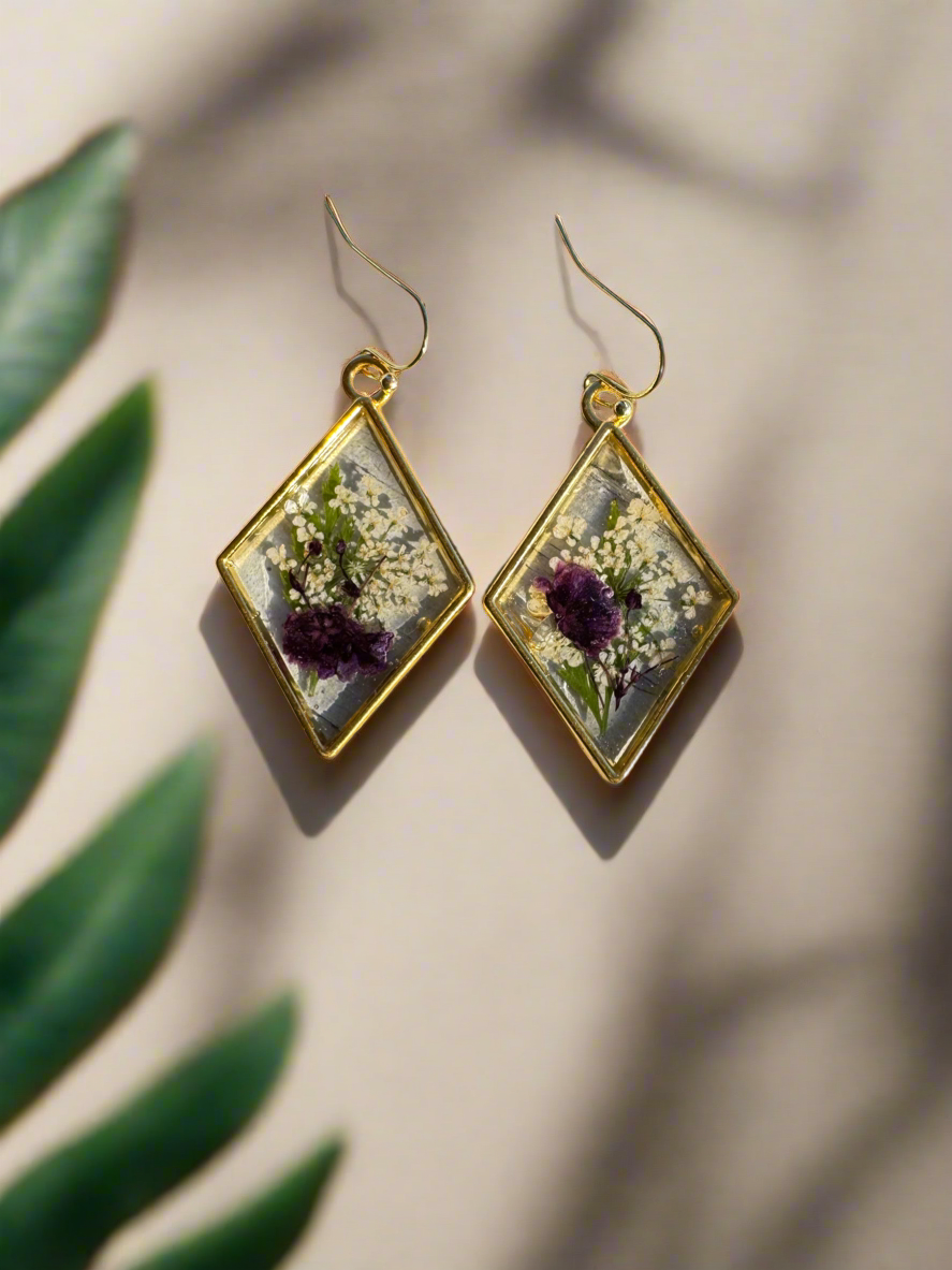 These Large Gold Diamond Resin Dangles are expertly crafted with resin and pressed flowers, making them exquisite earrings for any occasion. The gold accents add a touch of elegance to the unique design, providing a perfect balance of sophistication and beauty. Add them to your collection today.