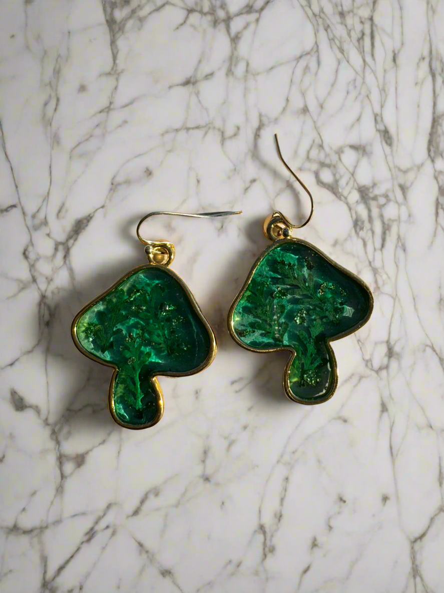 Add a touch of nature and elegance to your look with our Gold Mushroom Resin Dangles. Made with real pressed flowers and high-quality resin, these earrings are lightweight and versatile, perfect for any occasion. Elevate your style and make a statement with these unique and beautiful dangles.