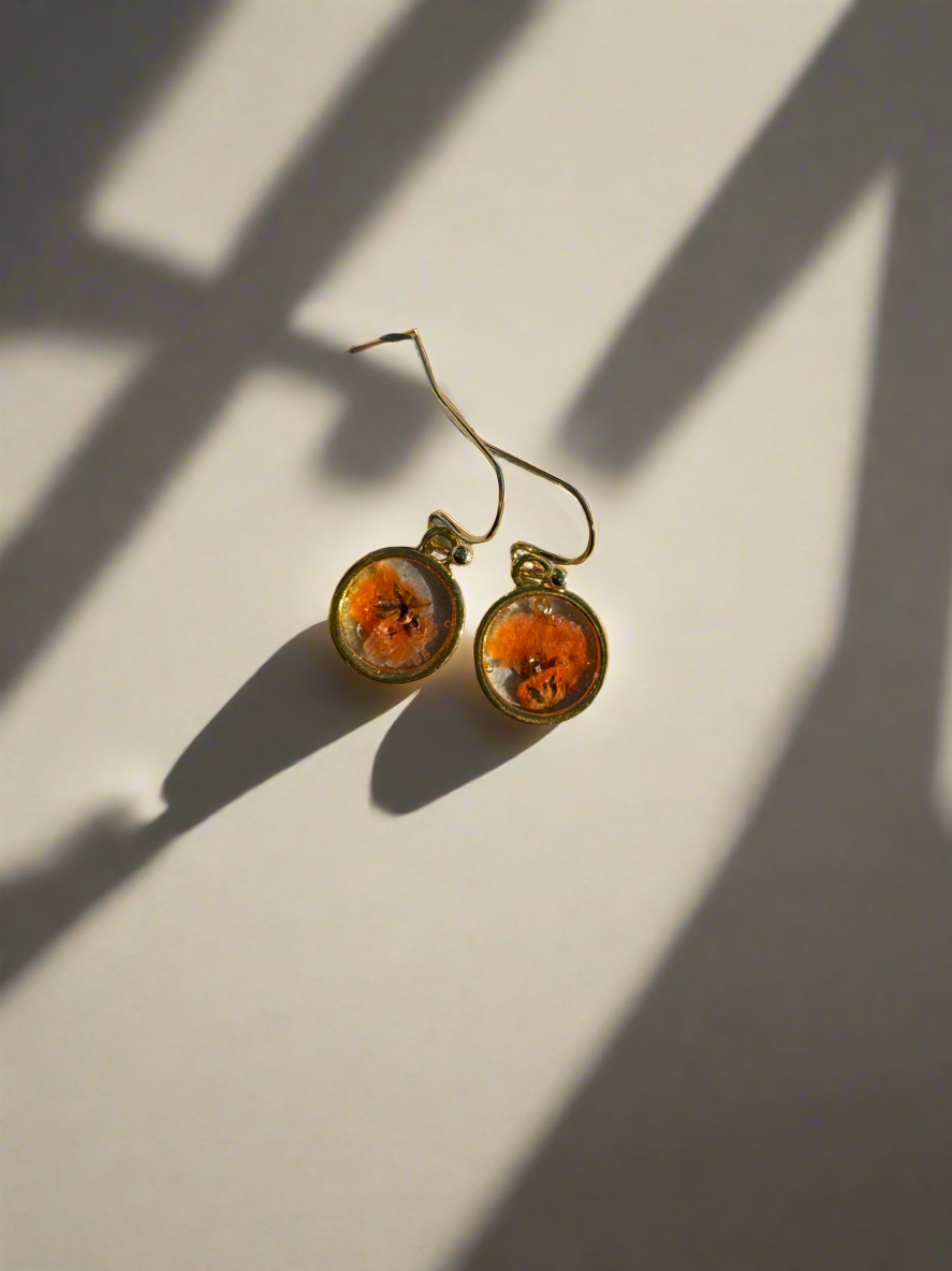 Add a touch of nature and elegance to your look with our Gold Circle Resin Dangles. Made with real pressed flowers and high-quality resin, these earrings are lightweight and versatile, perfect for any occasion. Elevate your style and make a statement with these unique and beautiful dangles.