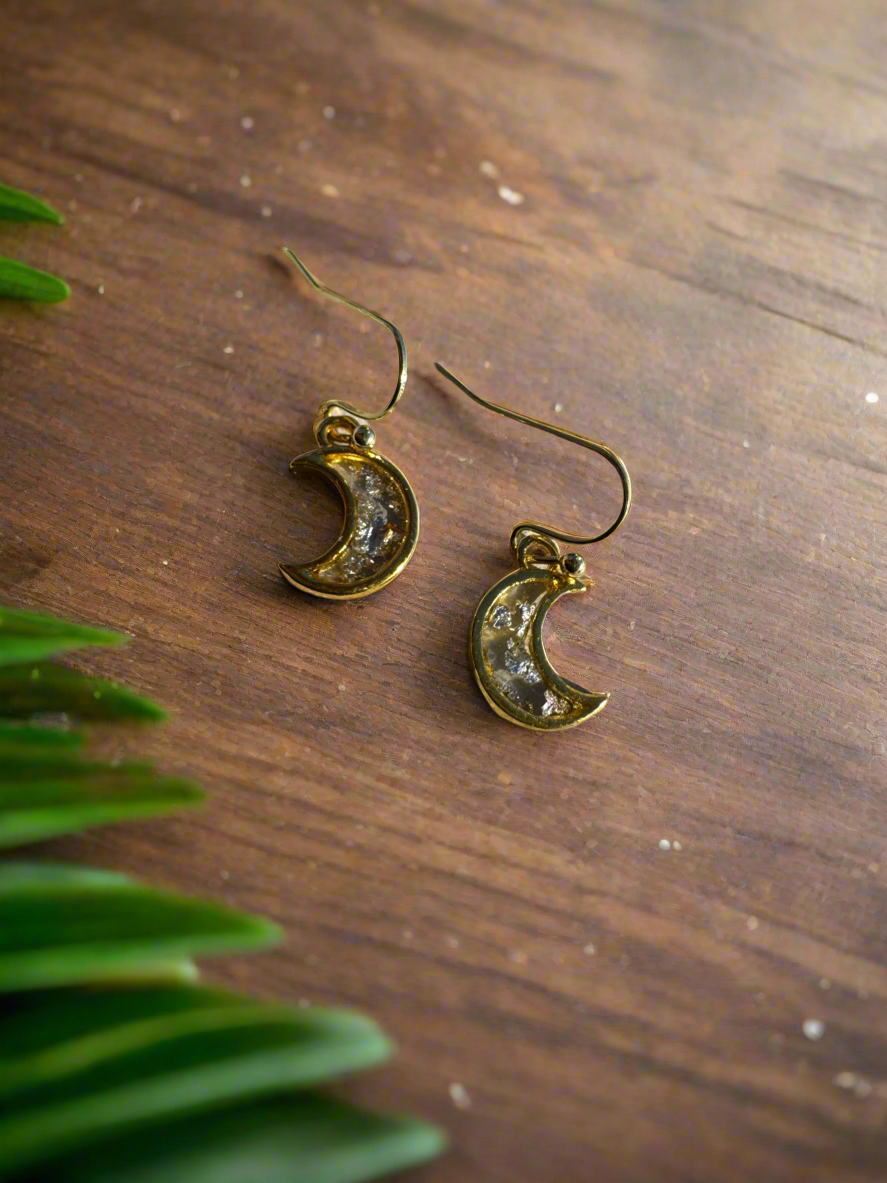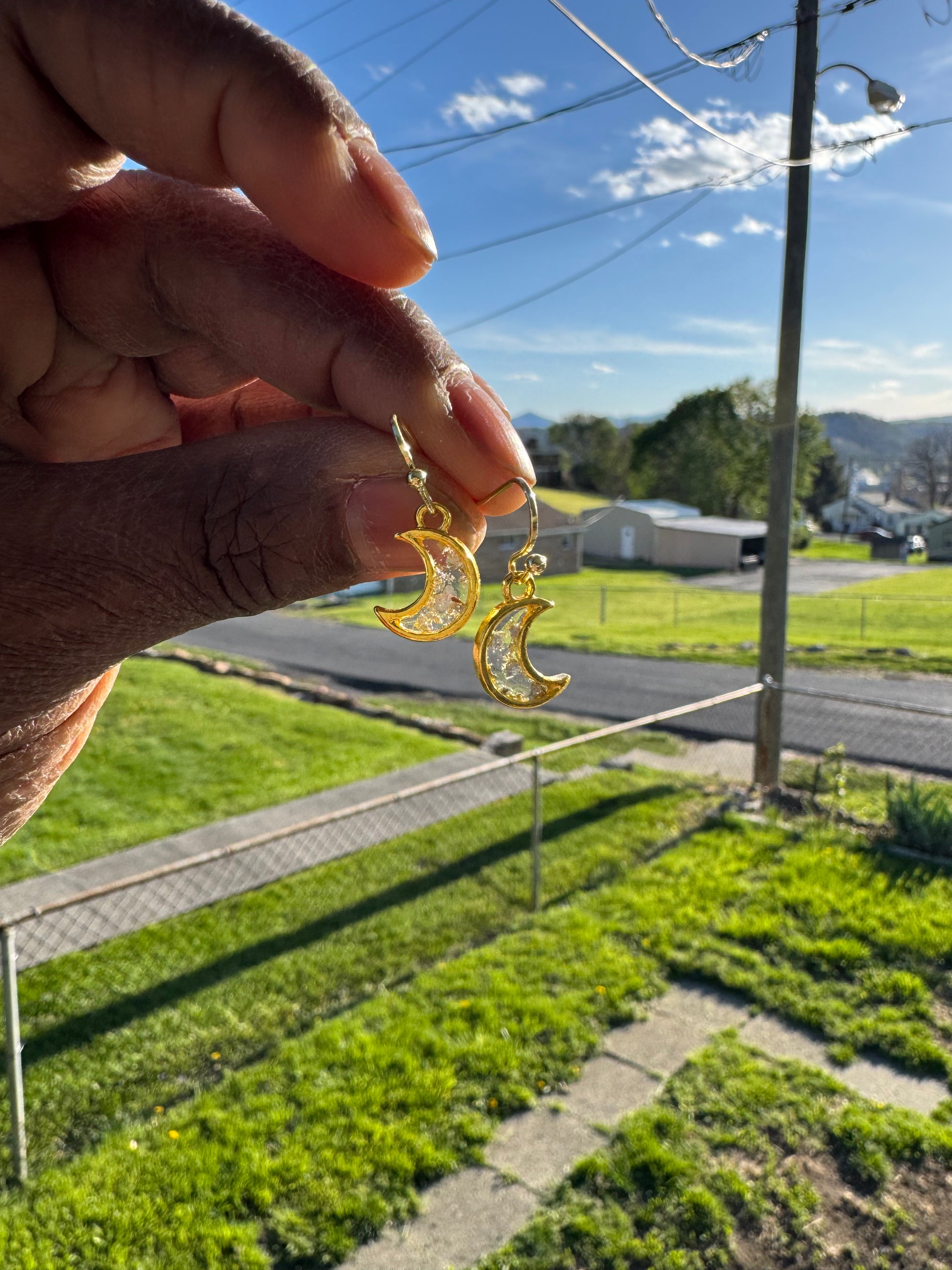 Step into the celestial realm with our Gold Moon Resin Dangles! These stunning earrings feature a gold moon encased in clear resin, sprinkled with shimmering silver flakes. Experience the magic of the night sky every time you wear these dangles.