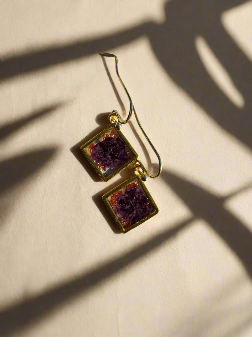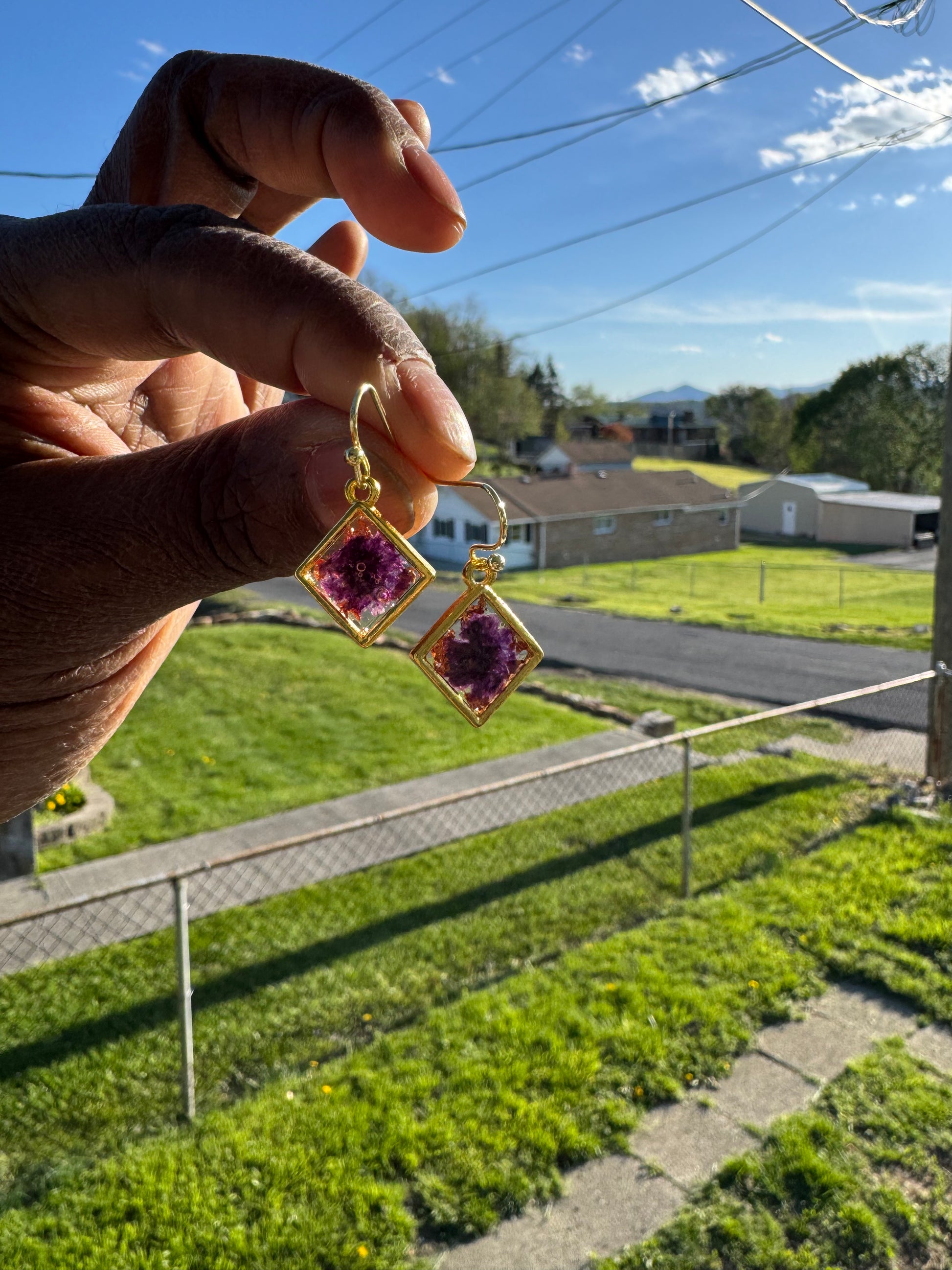 Indulge in the beauty of nature with our Gold Diamond Resin Dangles. Crafted with pressed flowers encased in clear resin, these earrings make a stunning statement piece. Elevate any outfit and bring a touch of elegance to your style. Handcrafted with love and passion, each pair is truly one-of-a-kind.