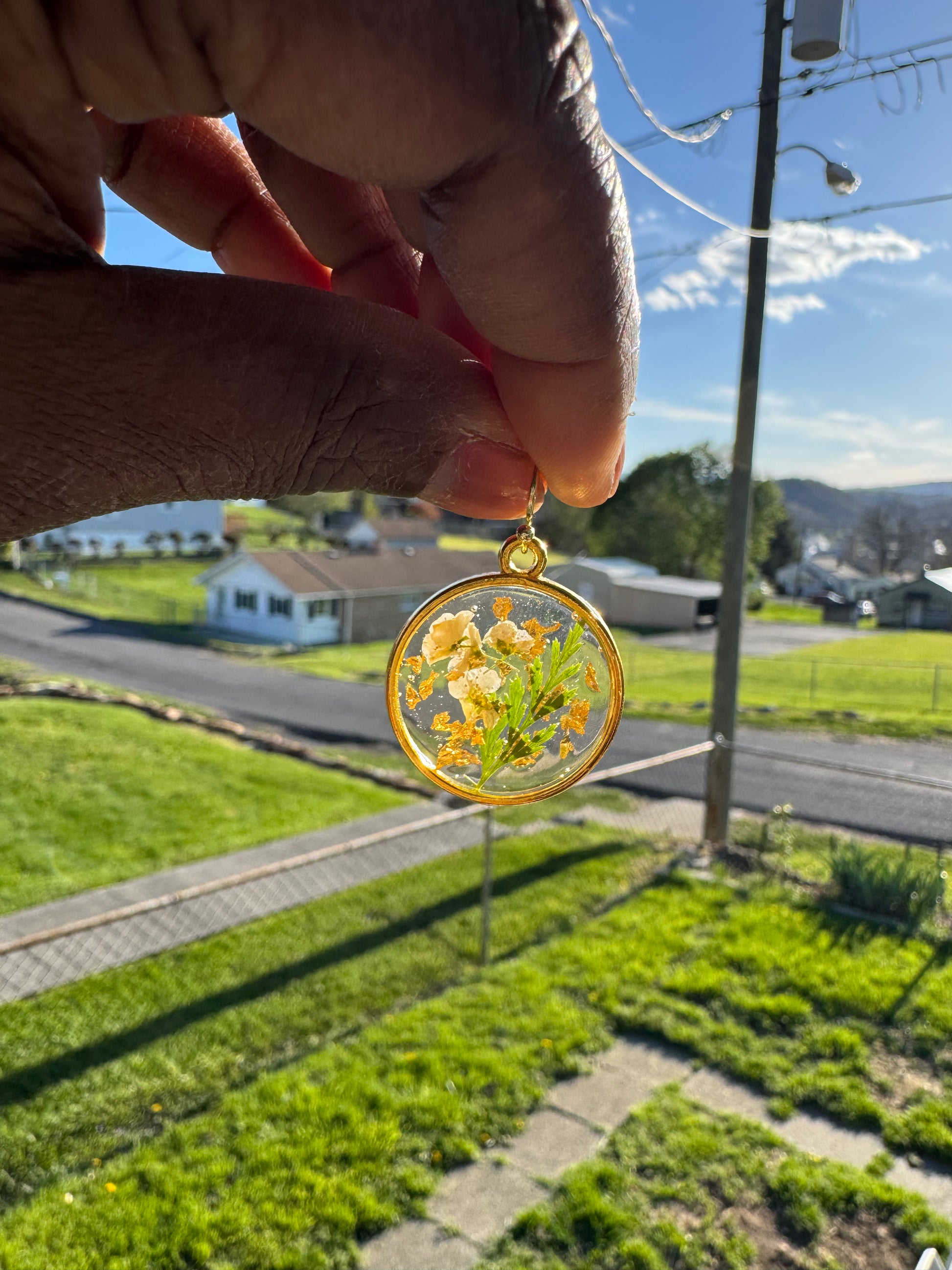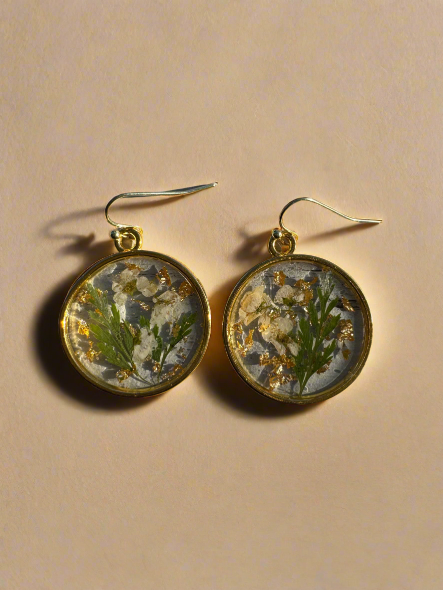 These Large Gold circle Resin Dangles are expertly crafted with resin and pressed flowers, making them exquisite earrings for any occasion. The gold accents add a touch of elegance to the unique design, providing a perfect balance of sophistication and beauty. Add them to your collection today.