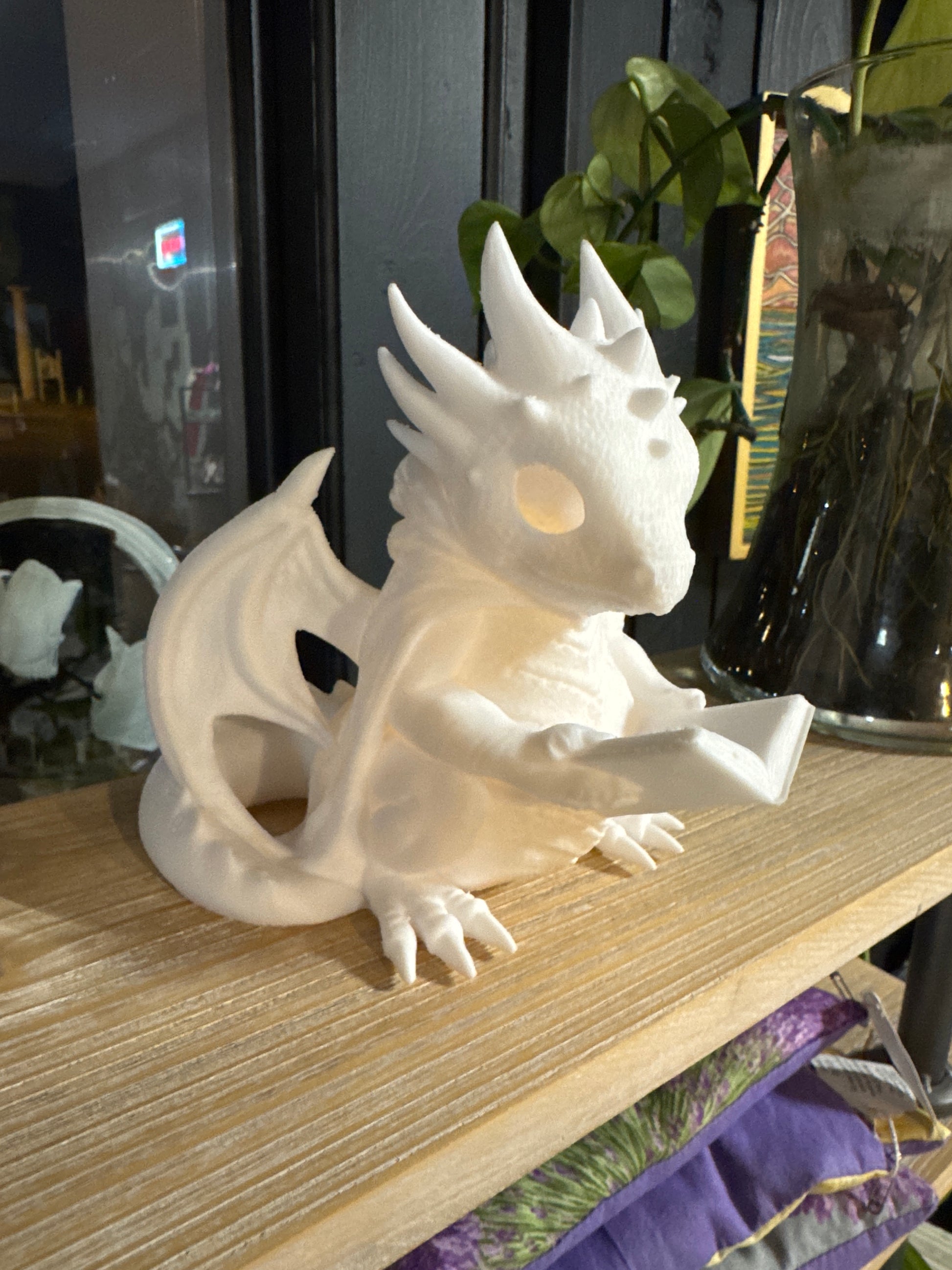 This Dragon tea light features a 3D printed dragon reading a book, adding a magical touch to your home decor. Expertly crafted, it allows you to enjoy the soft glow of a tea light while admiring the intricate design of the dragon. A must-have for any fantasy enthusiast.