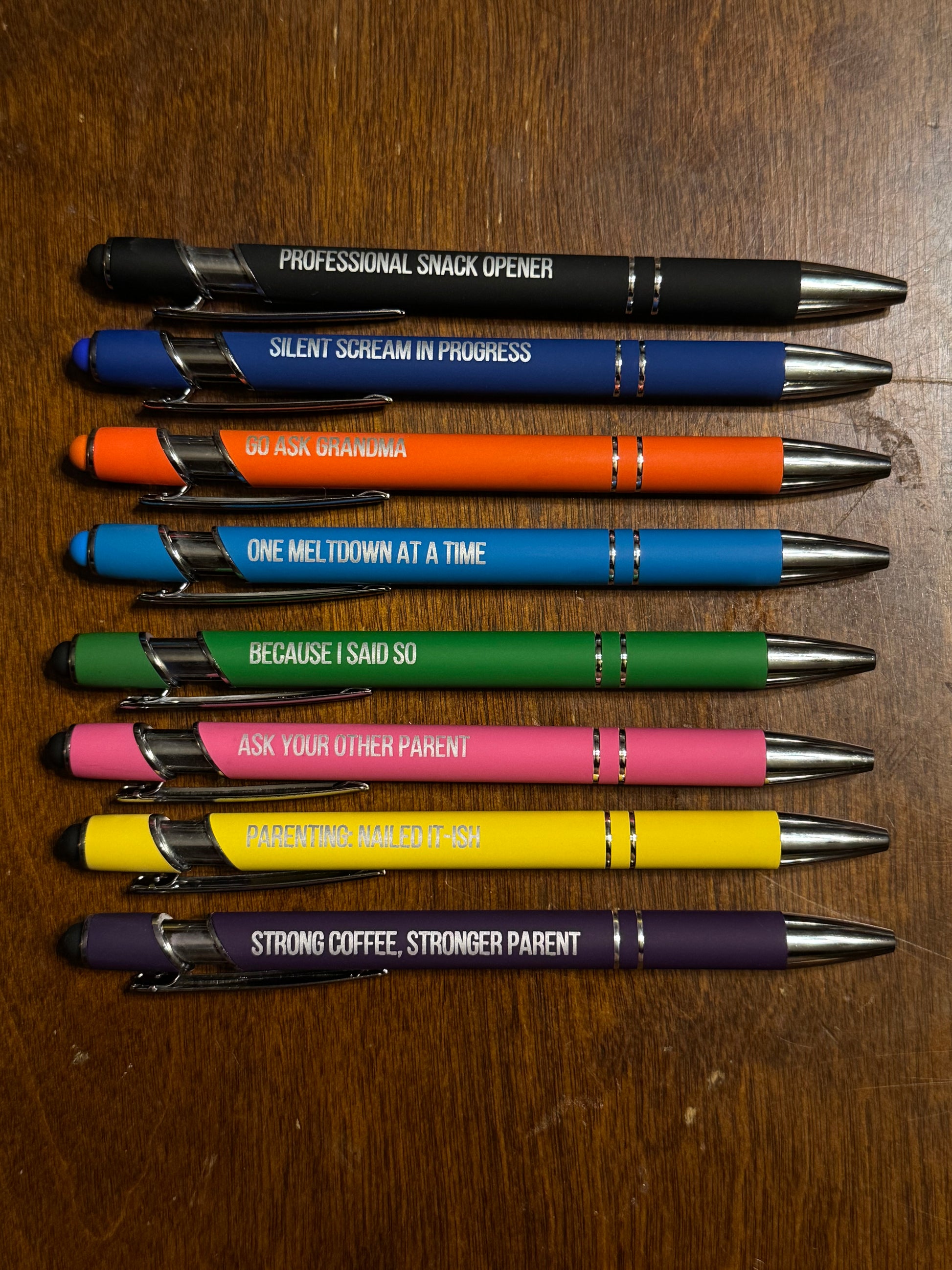 Experience effortless writing and navigation with our set of 8 stylus pens. With a comfortable grip and smooth, fast-drying black ink, these pens are perfect for any task. Each pen is engraved with funny and snarky sayings, bringing a bit of humor to your daily routine.