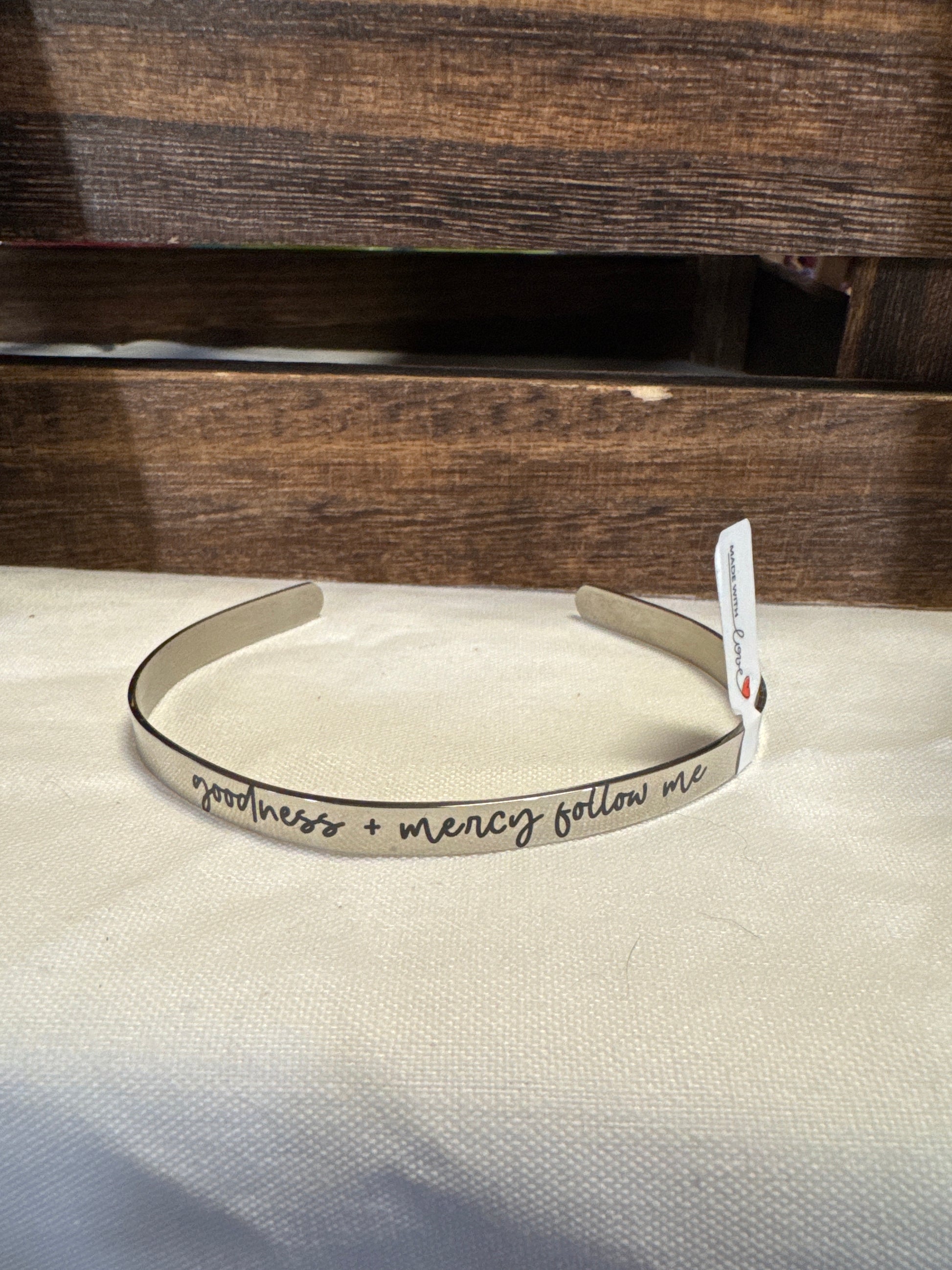The Goodness + Mercy cuff is a stainless steel bracelet that not only adds a touch of style to any outfit, but also serves as a daily reminder of inspiration and positivity. With its sleek design and meaningful message, this cuff will be a source of support and encouragement for every wearer.