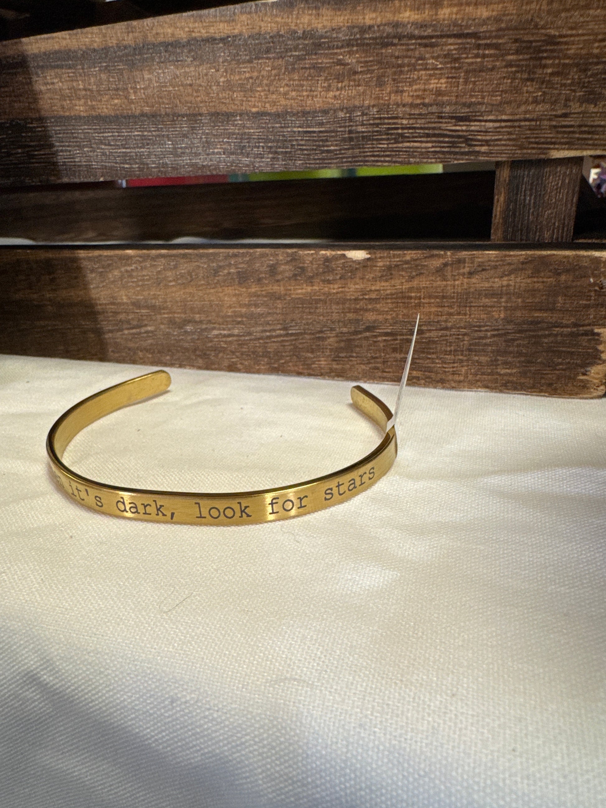 The cuff is a stainless steel bracelet that not only adds a touch of style to any outfit, but also serves as a daily reminder of inspiration and positivity. With its sleek design and meaningful message, this cuff will be a source of support and encouragement for every wearer.