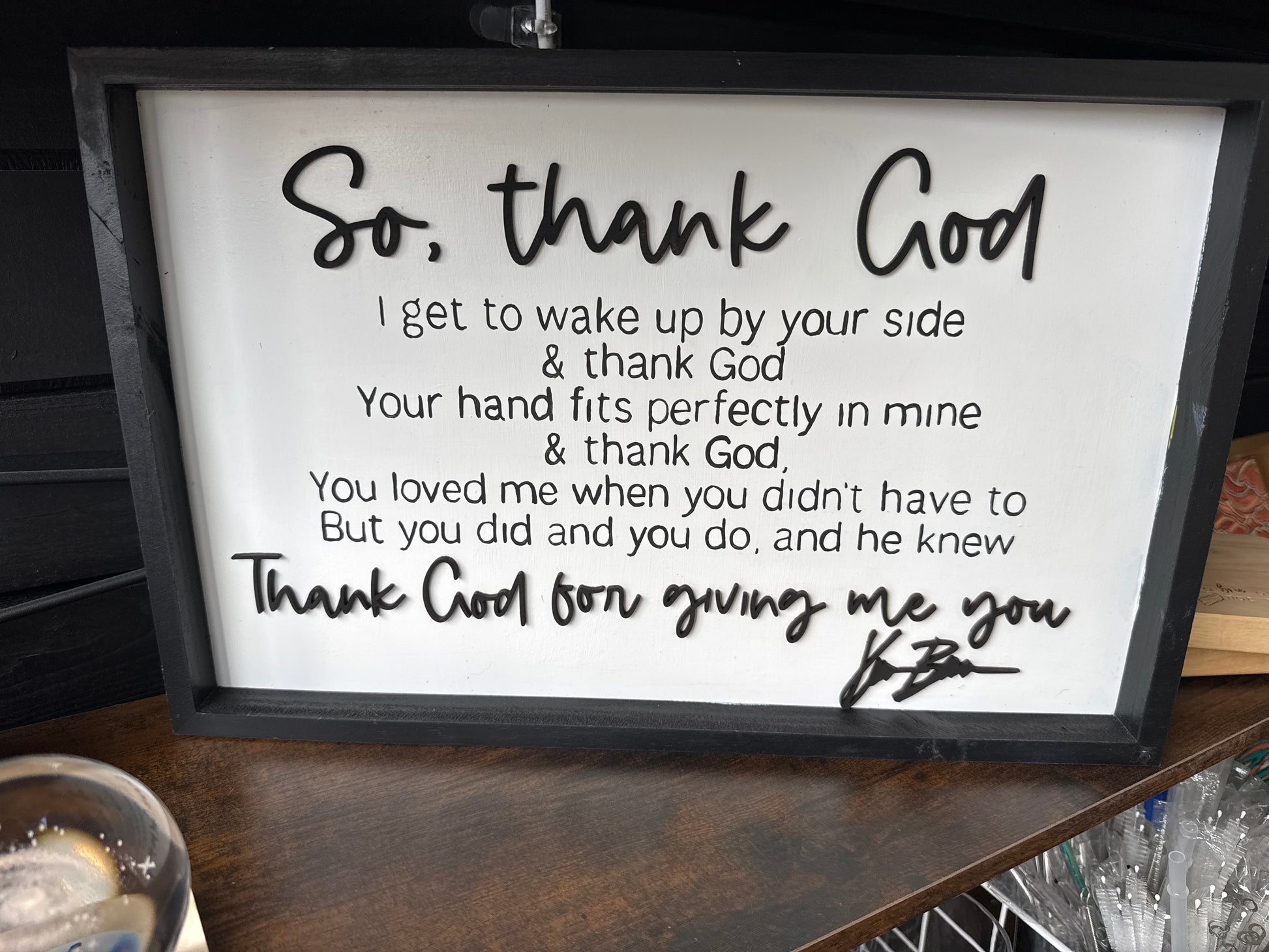 Crafted using laser cut technology, this striking sign showcases the popular lyrics from Kane Brown's hit song "Thank God". Measuring 11 x 17 inches, it is the perfect addition to any decor.
