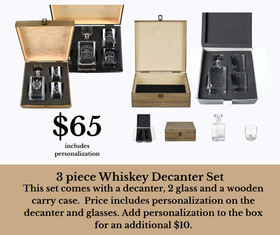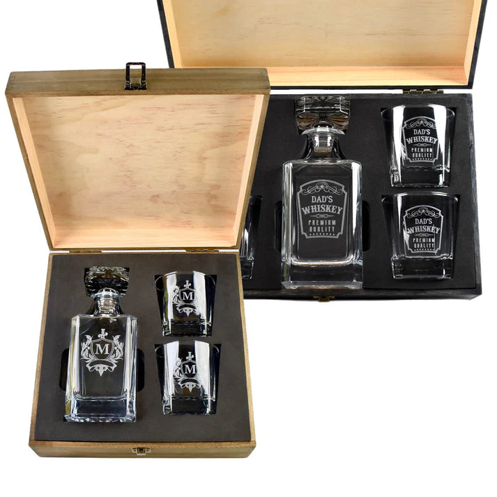 The set comes with a decanter, 2 glasses and a wooden carrying box.